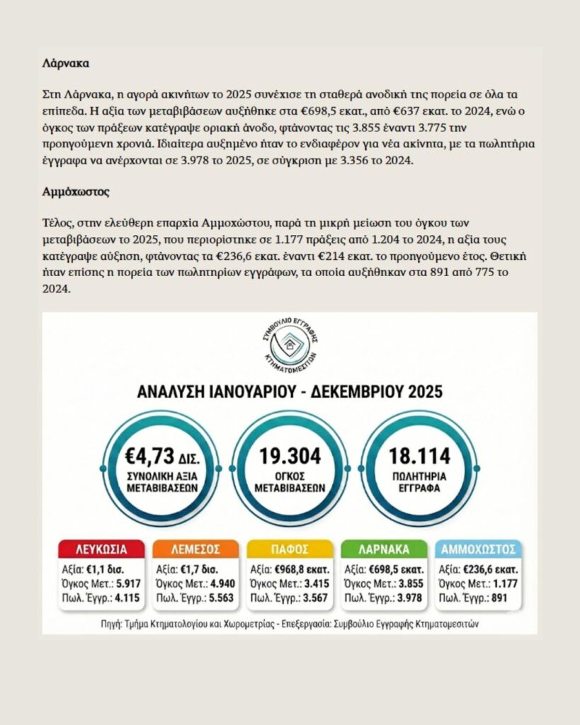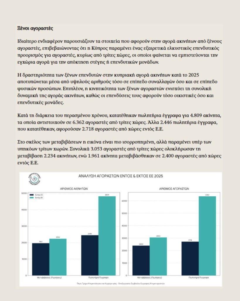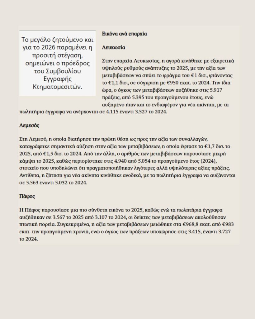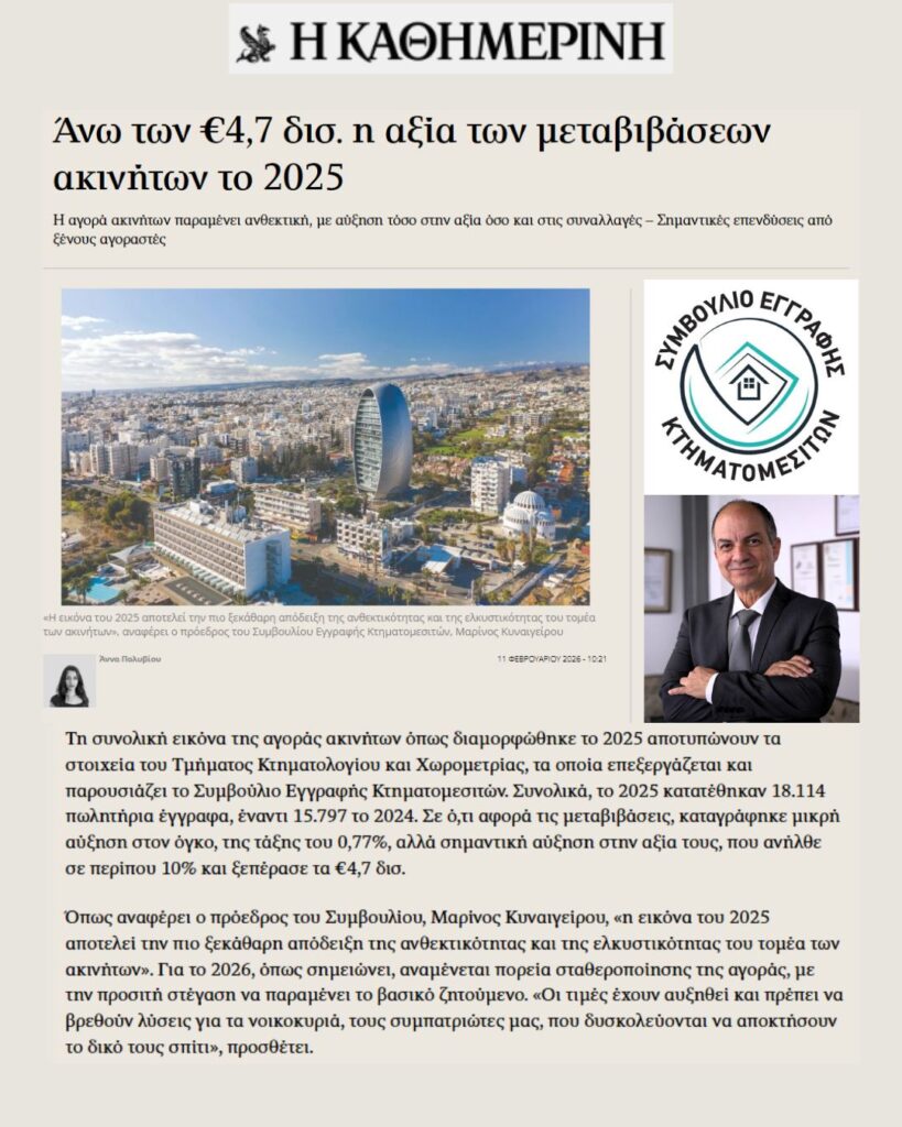 Σύμφωνα με τον πρόεδρο του Συμβουλίου, Μαρίνος Κυναιγείρου «η εικόνα του 2025 αποτελεί την ξεκάθαρη απόδειξη της ανθεκτικότητας και της ελκυστικότητας του τομέα των ακινήτων».
