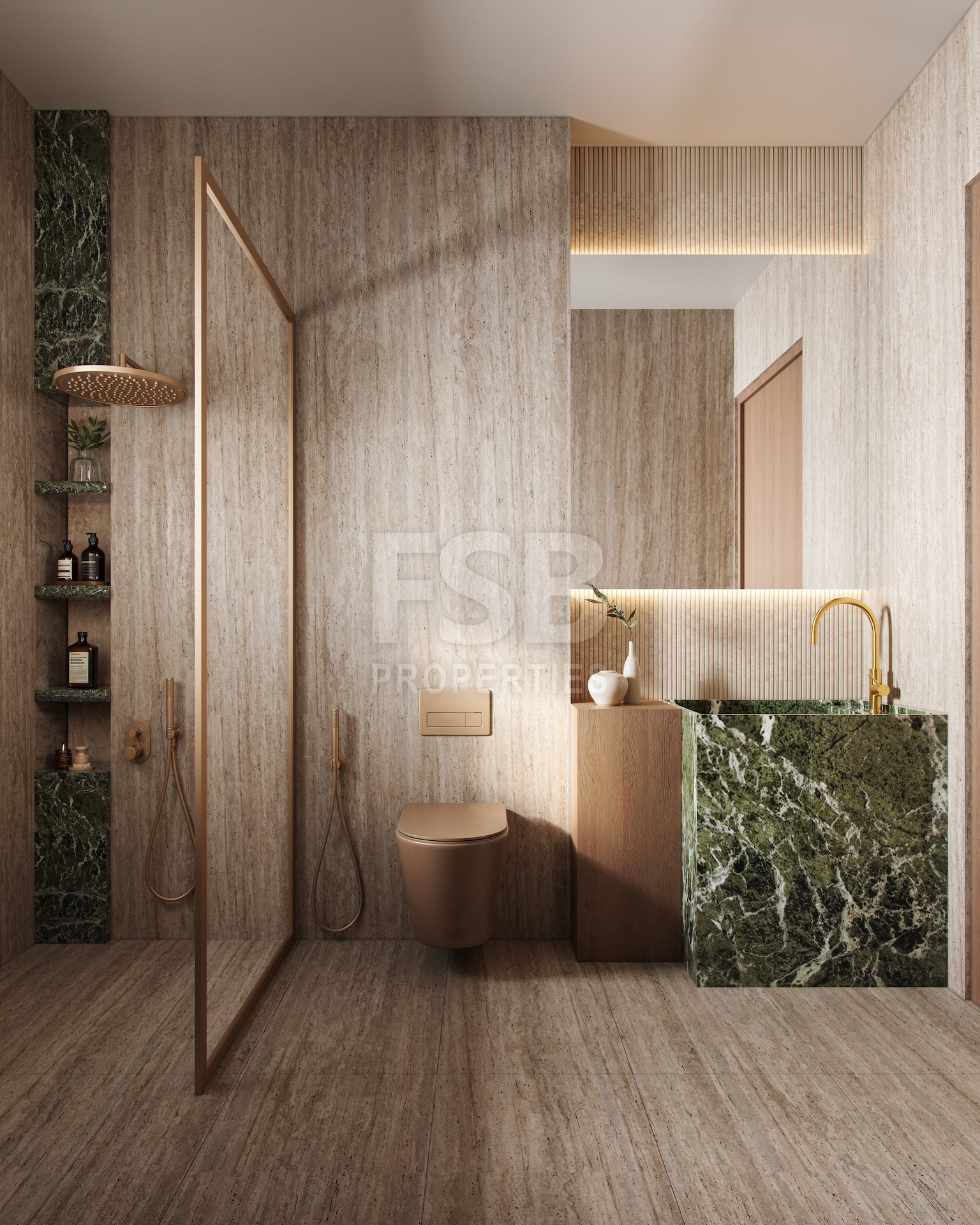The contemporary exterior harmoniously blends materials and textures, while apartments in earthy tones and minimalist aesthetics feature premium finishes and large windows that flood the spaces with natural light, creating a serene, welcoming atmosphere.