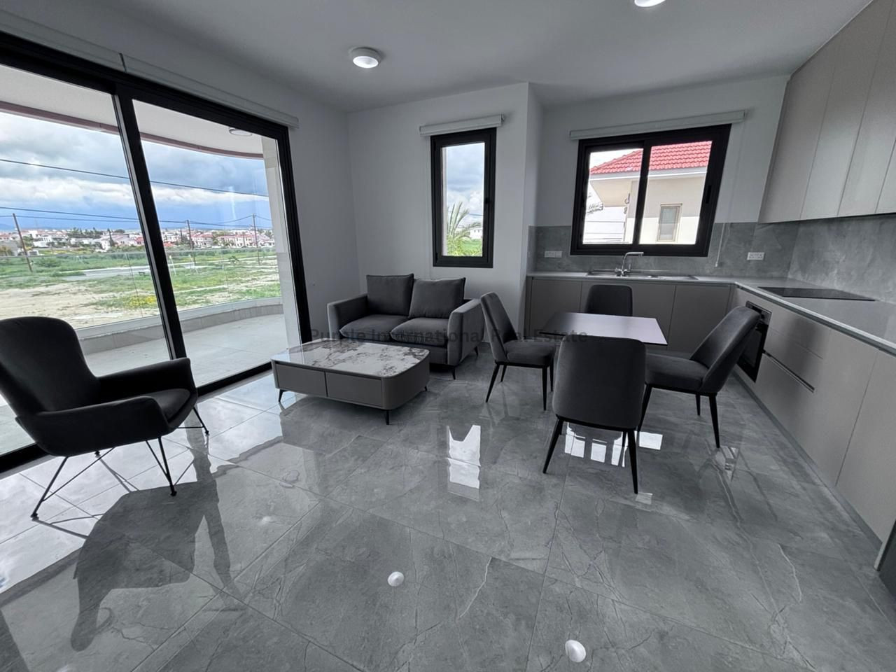 Step into a fully furnished living space, complete with a welcoming lounge and dining area. The kitchen is equipped with quality appliances, plenty of cabinets, and all essentials for everyday use. Contemporary finishes and tasteful decor create an inviting atmosphere throughout the apartment.