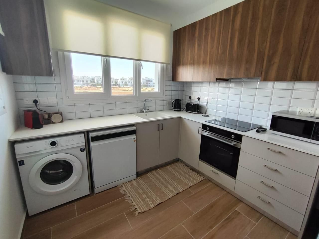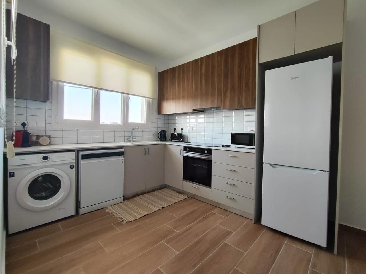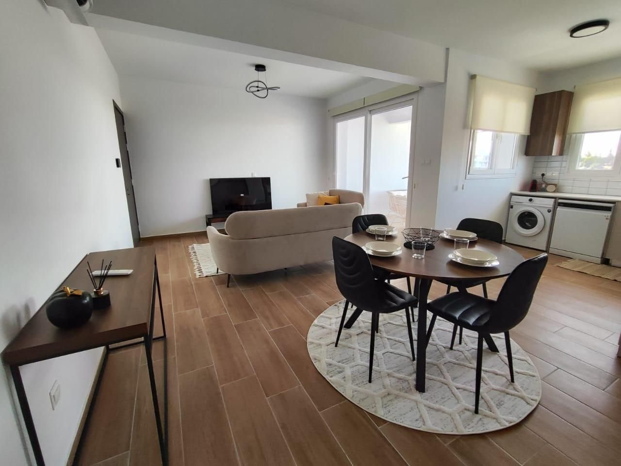 The apartment was built in 2024 and comes fully furnished with contemporary furniture and high-quality appliances. The open-plan living and dining area creates a warm, inviting atmosphere, while large windows let in plenty of natural light. Both bedrooms are spacious with ample storage, and the sleek bathroom features modern fixtures.