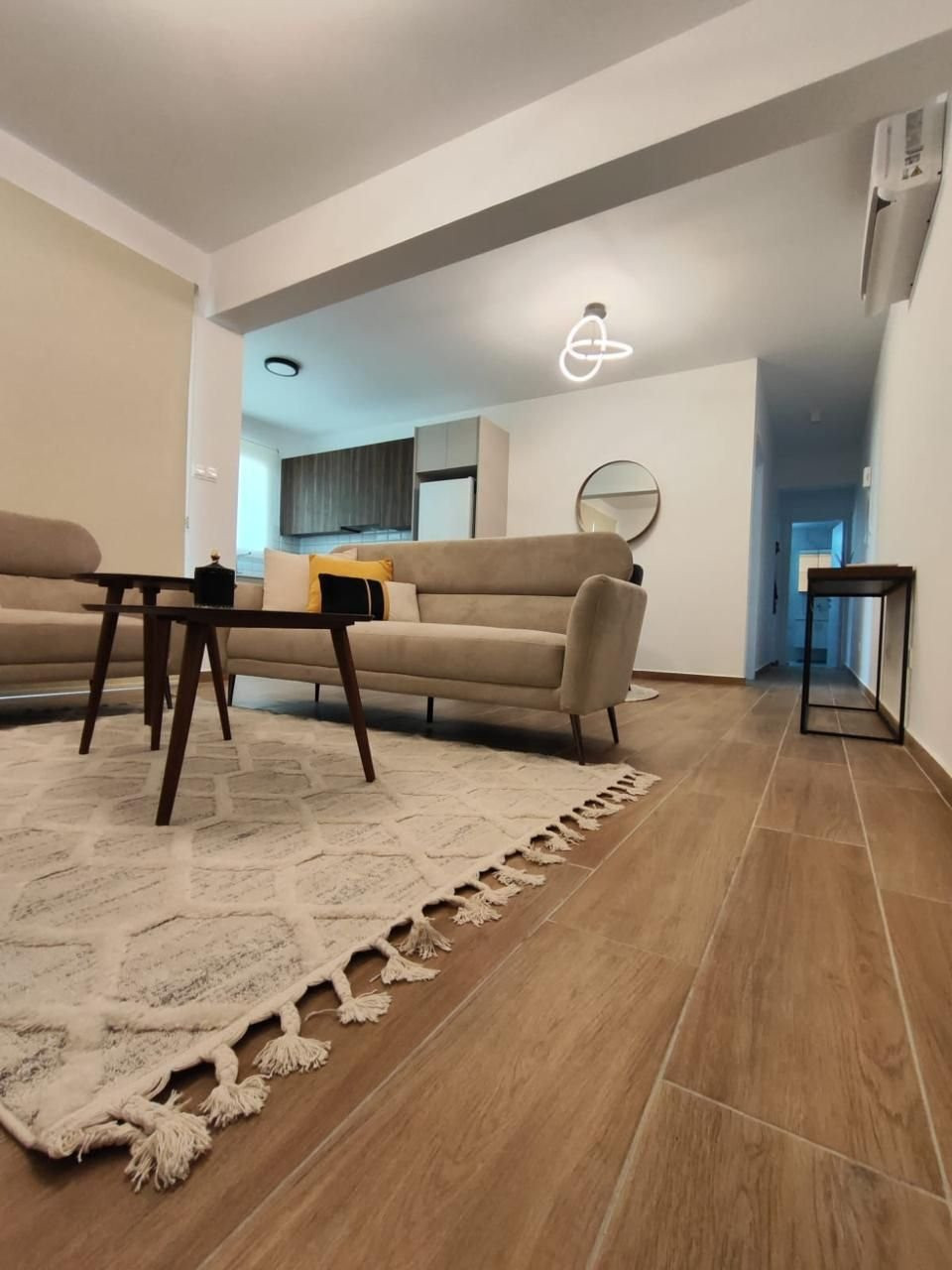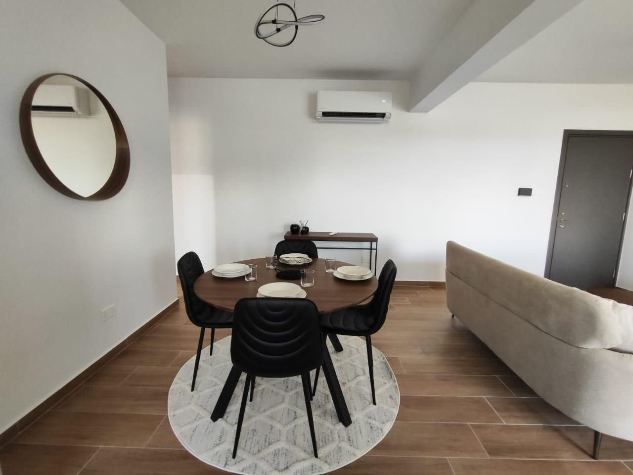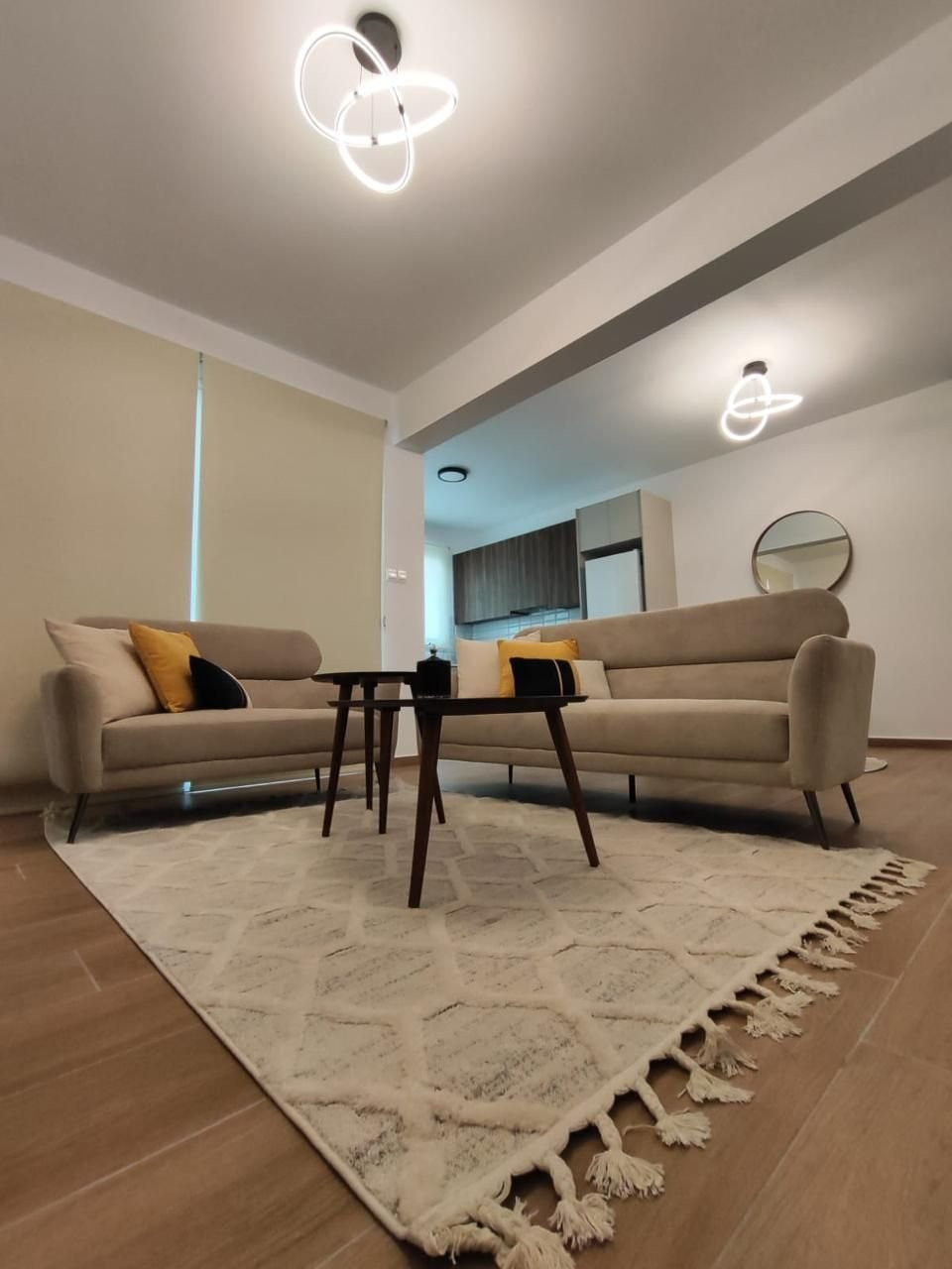 The apartment was built in 2024 and comes fully furnished with contemporary furniture and high-quality appliances. The open-plan living and dining area creates a warm, inviting atmosphere, while large windows let in plenty of natural light. Both bedrooms are spacious with ample storage, and the sleek bathroom features modern fixtures.