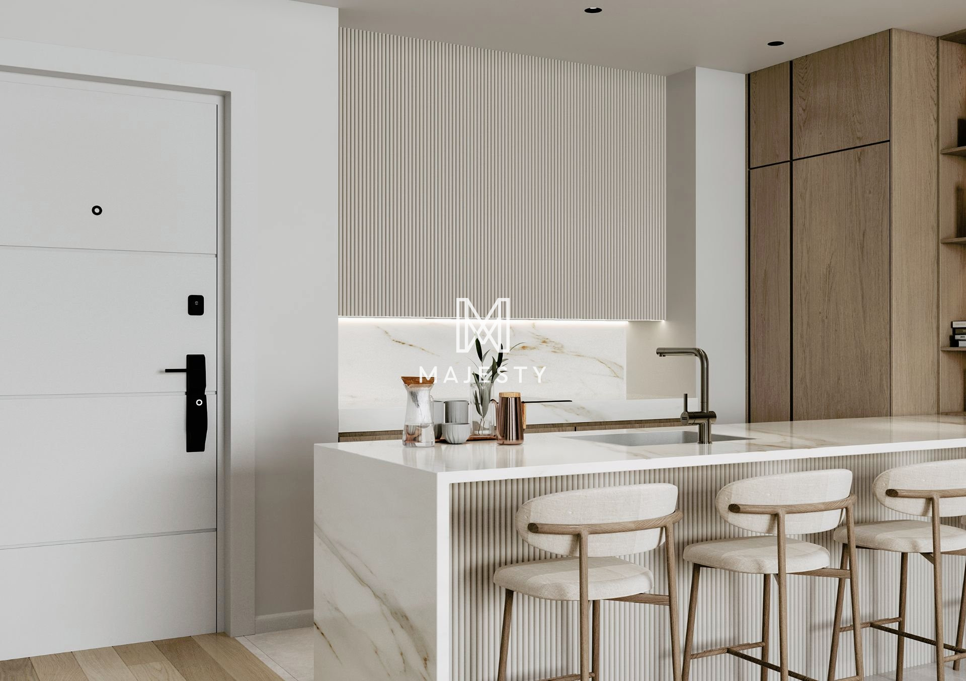 • Security door with solid core and intercom system with colour display screen.