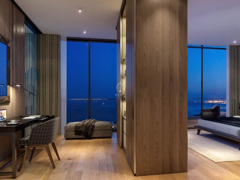 Modern one bedroom apartment with views, located in Agios Tychonas area. Situated on a 27 floor building, has easy access to the highway, astonishing sea views and its close to all city amenities. Some of the indoor amenities it has are: heated indoor pool, jacuzzi area, sauna, steam room, massage room, fitness center, residents lounge, co working area, and private event area.