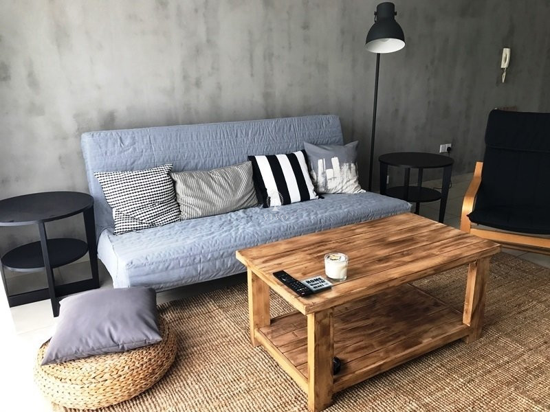 The apartment comes fully furnished and equipped, boasting a well-appointed kitchen, modern bathroom with new shower facilities, and a comfortable bedroom with all necessities. The industrial design elements blend seamlessly with the spacious layout, creating an inviting atmosphere that’s both stylish and functional.