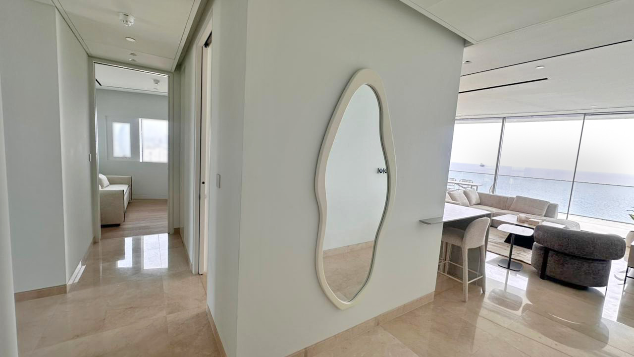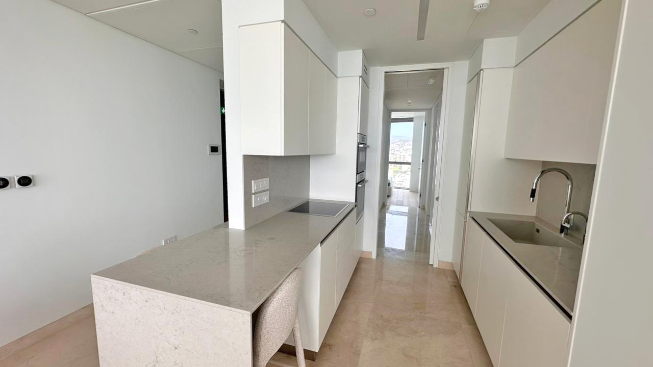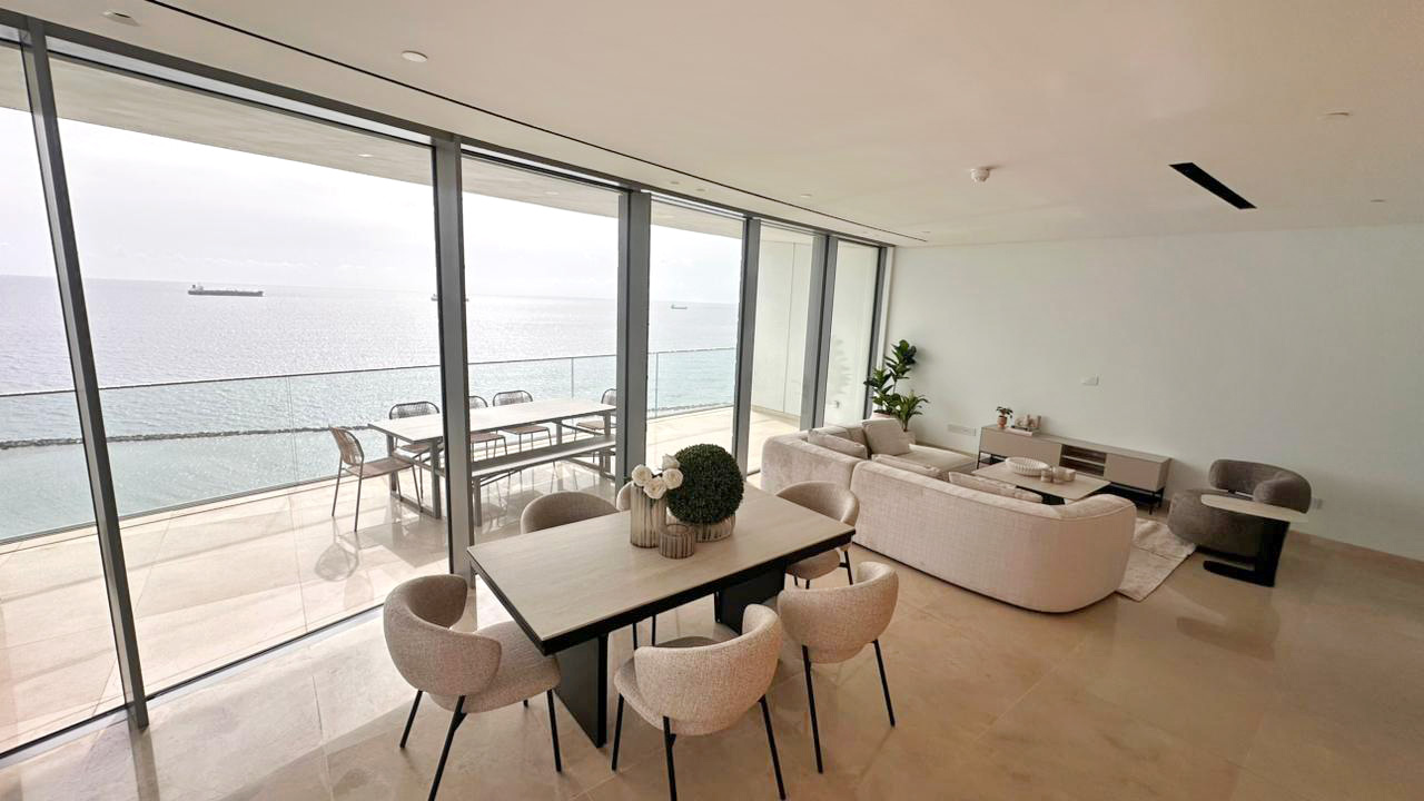 This is an exceptional three bedroom sky residence set within the tallest residential building in this part of the Mediterranean, commanding uninterrupted panoramic sea views and extraordinary natural light. Expansive floor to ceiling glazing opens onto a generous covered veranda creating a seamless indoor outdoor lifestyle designed for refined coastal living and sunset entertaining. The residence offers elegant open plan living and dining, a private master suite and two additional bedrooms ideal for family or distinguished guests. Residents enjoy exclusive access to concierge services, state of the art fitness and wellness facilities, private lounge areas and resort style pool decks directly on the seafront promenade. Dedicated parking and storage are included, presenting a rare opportunity to secure an iconic lifestyle asset at one of the most prestigious addresses on the coastline.