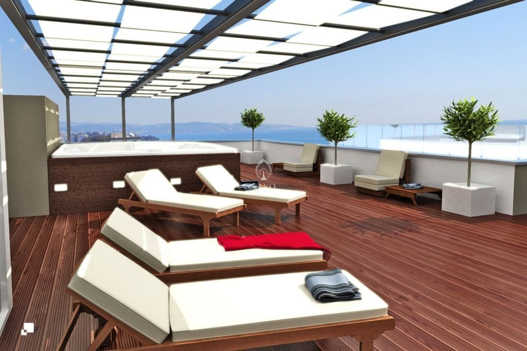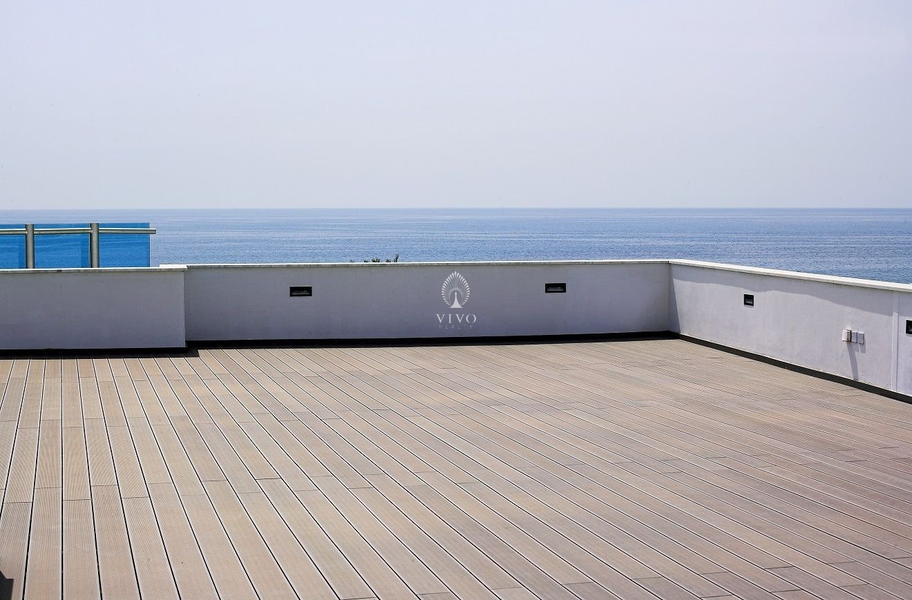 This perfectly designed apartment consists of an open plan living area with kitchen and access to covered veranda with sea view, 3 bedrooms (including one en-suite). This property offers a comfortable parking place with electric gate and a huge roof garden.