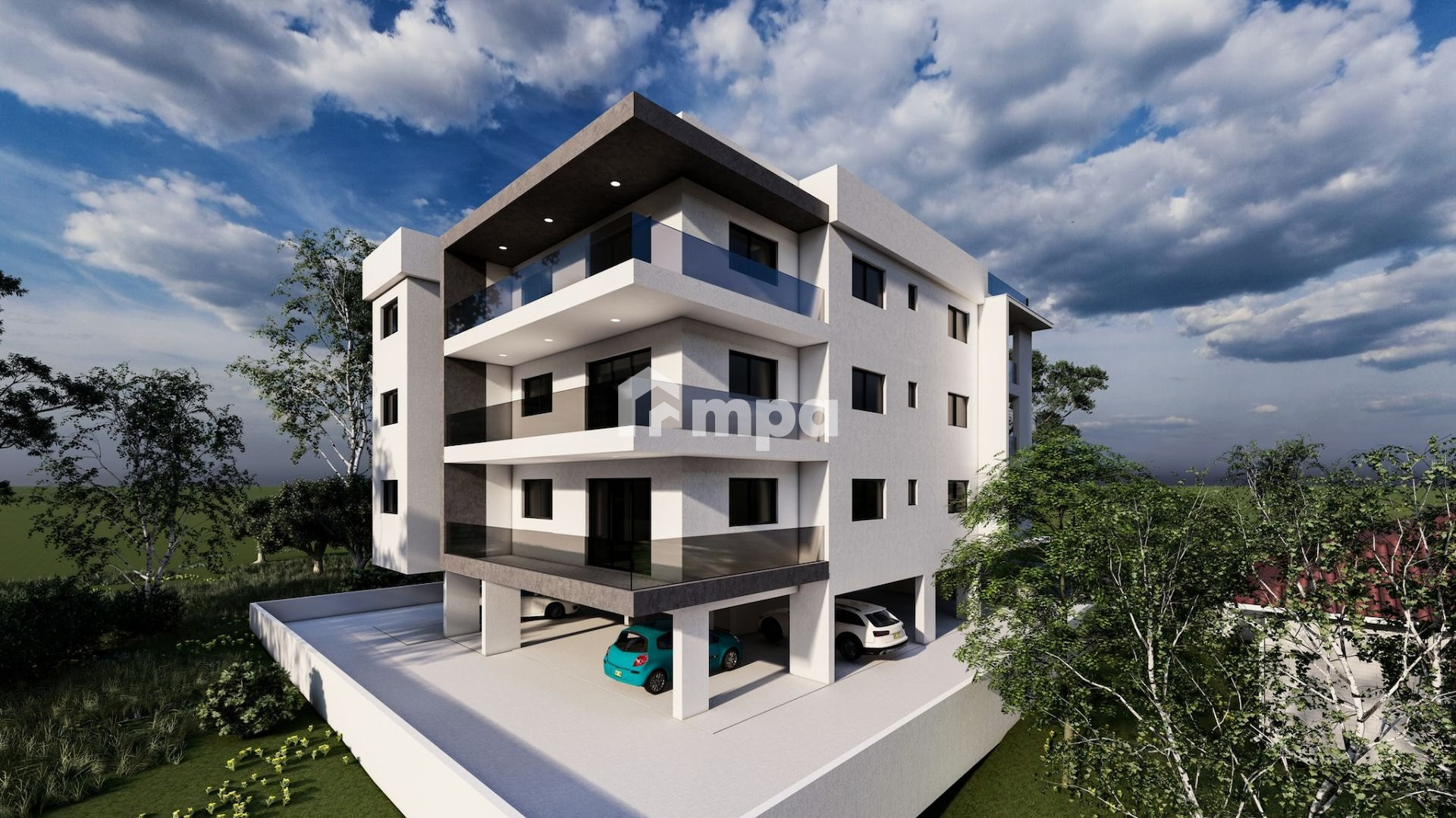 The building features an 8cm thermal insulation system, thermal-insulated aluminum frames with double glazing, and fully operational photovoltaic panels for 2- and 3-bedroom apartments.