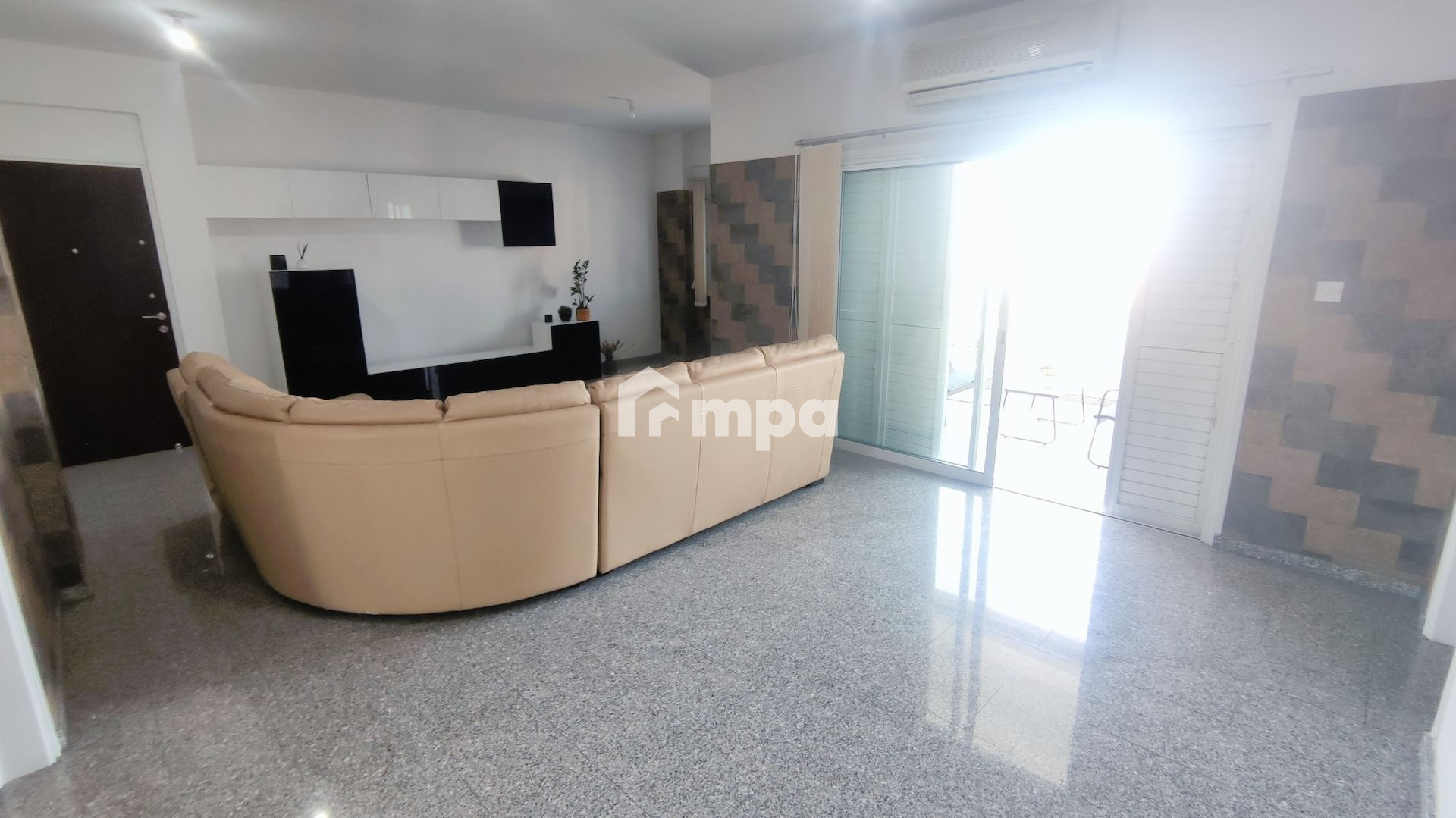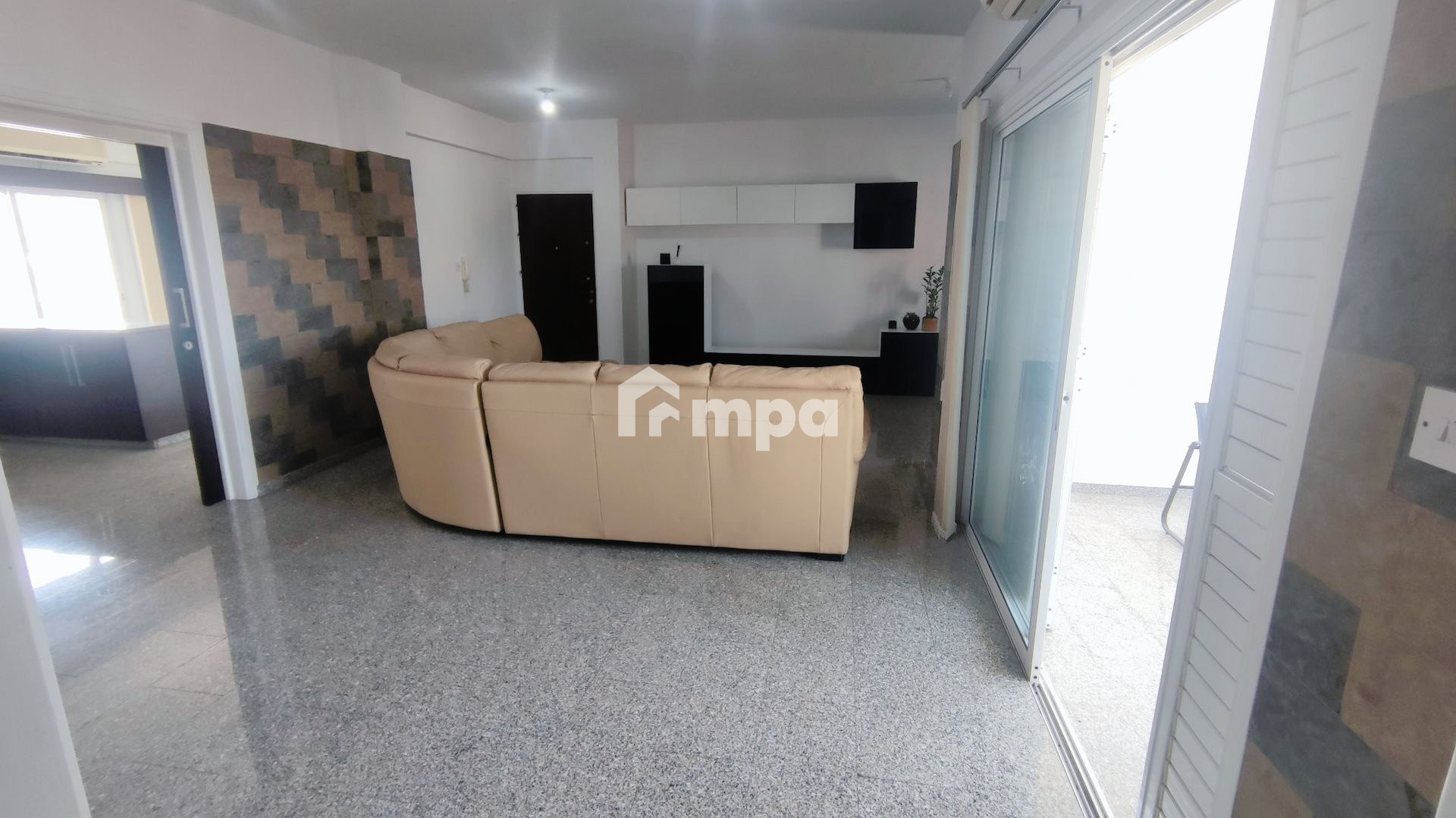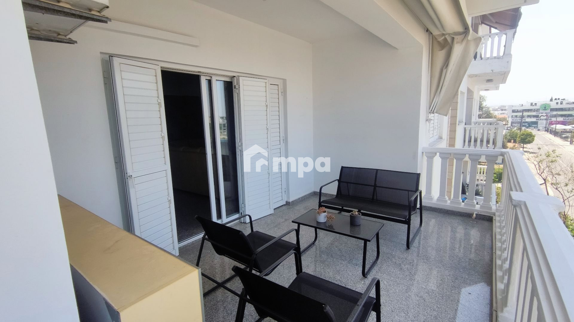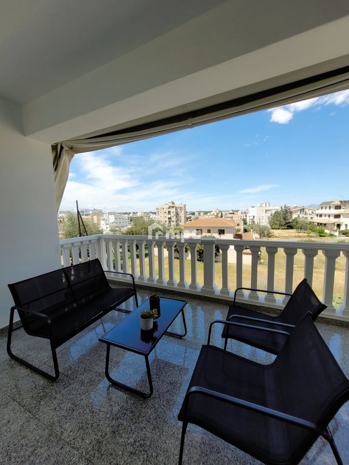 The apartment is fully furnished. The apartment was renovated. It has a living room, a spacious kitchen with kitchen appliances, three bedrooms, and two bathrooms, one has a shower and a large balcony with a nice view. A/C in all rooms and shutters in every window.