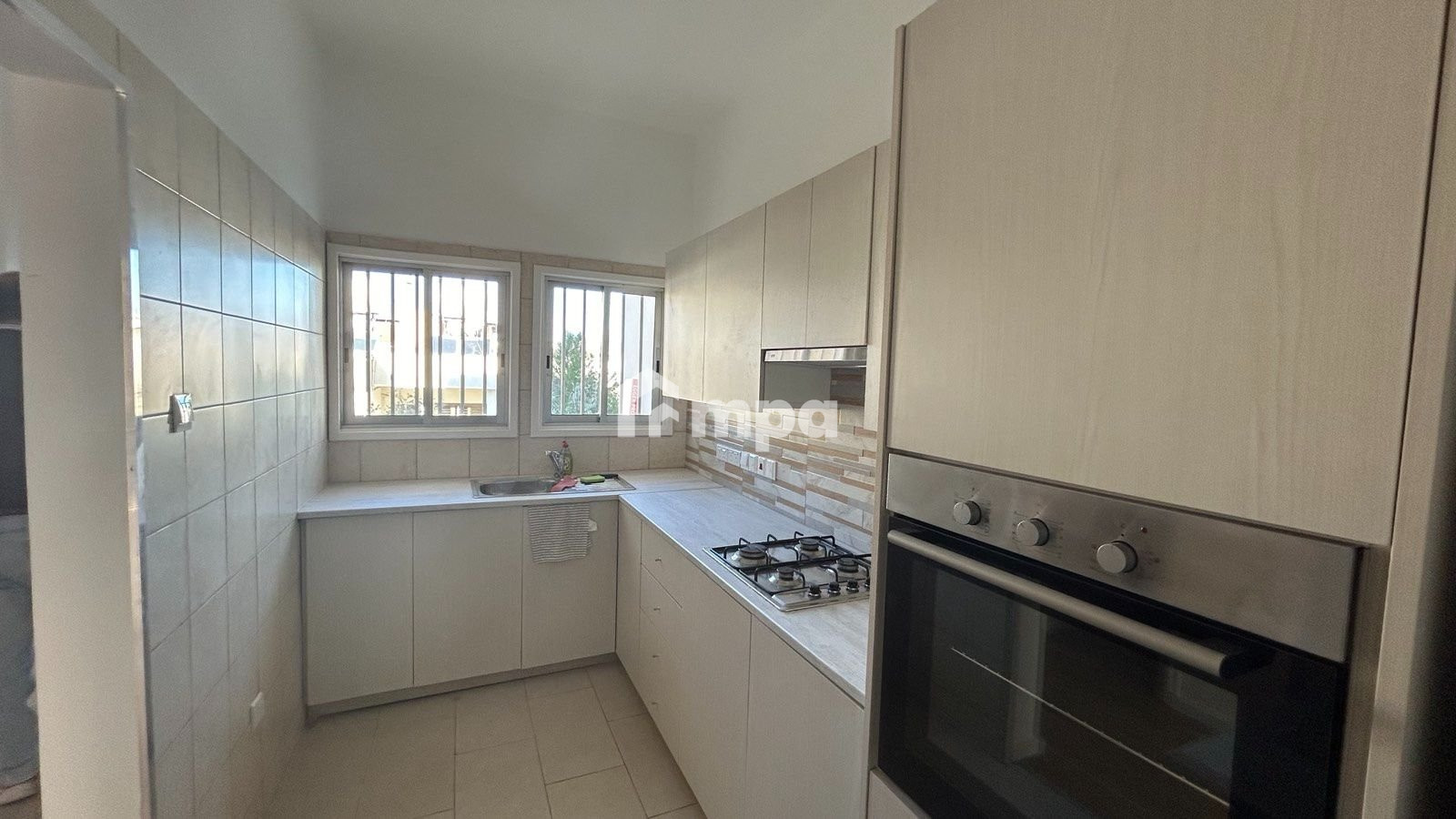 The apartment consists of a spacious open-plan living room with a fully equipped kitchen, two spacious bedrooms, a family bathroom, a huge uncovered veranda, and a large yard.