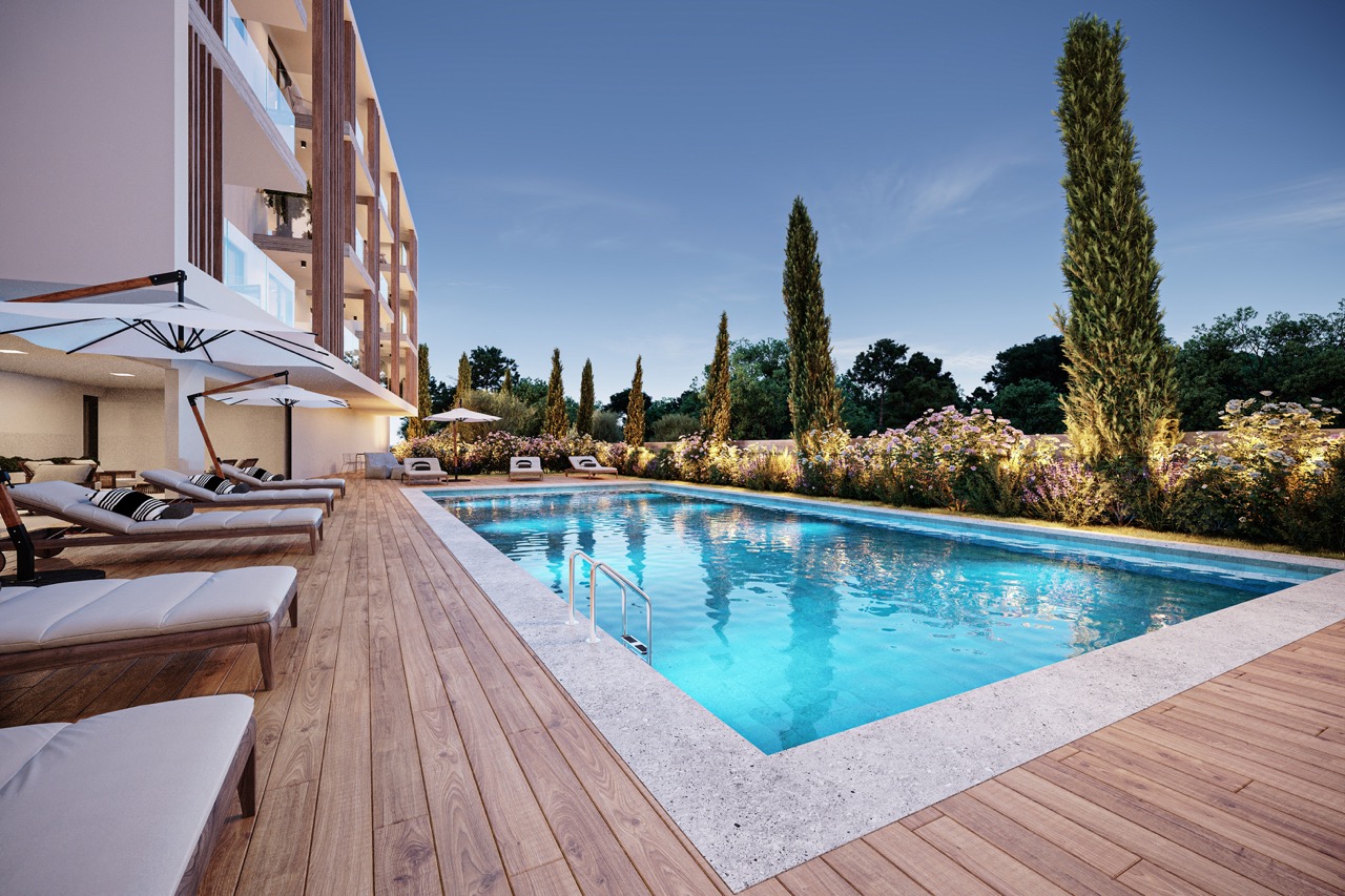 This development features two blocks of studio, one bedroom, and two bedroom apartments with a wide range of on site facilities. Located in the popular Universal area of Pafos, it is ideal for both short term rentals and permanent living. Designed to blend with its natural surroundings, the development is nestled among tall trees offering privacy and tranquility, just a ten minute walk from the sea, Pafos harbour, and local amenities. Built with modern construction techniques to minimize environmental impact and reduce lifecycle costs, it includes 22 units, a reception area, fitness centre, covered communal spaces, kids playground, landscaped gardens, and an 80㎡ swimming pool.