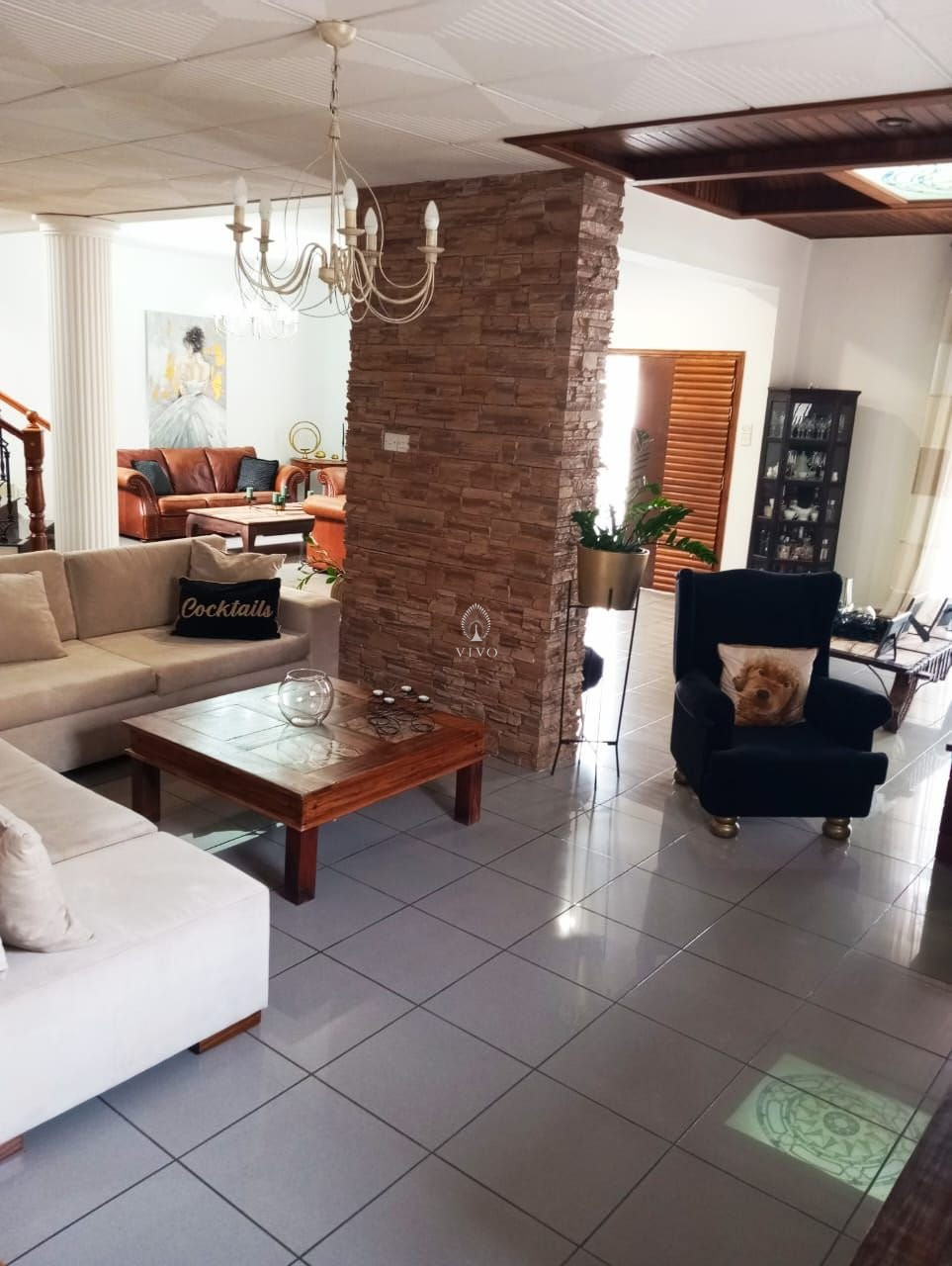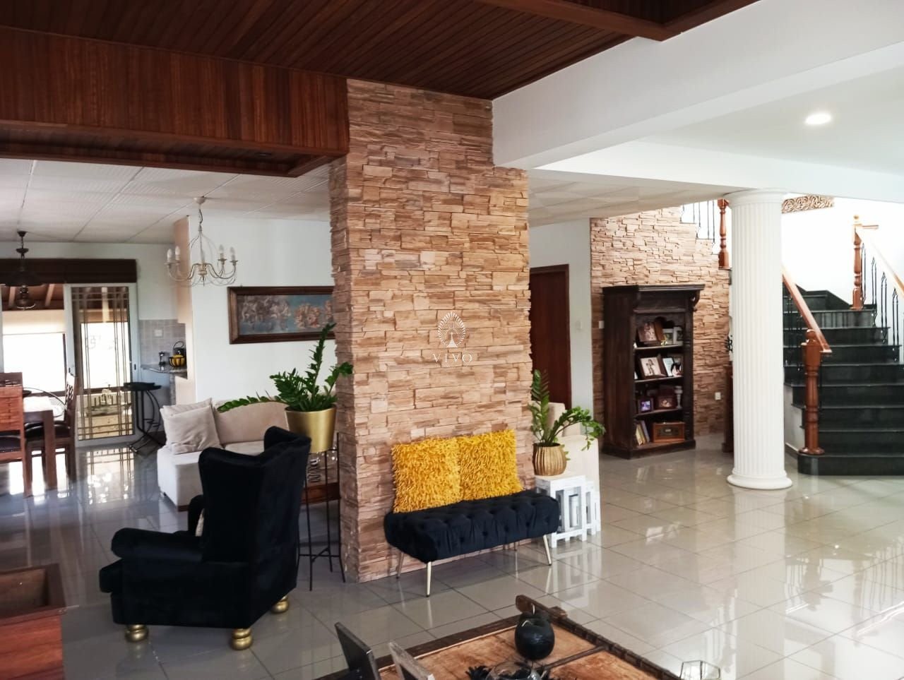* Spacious open-plan living and dining area with a cozy fireplace