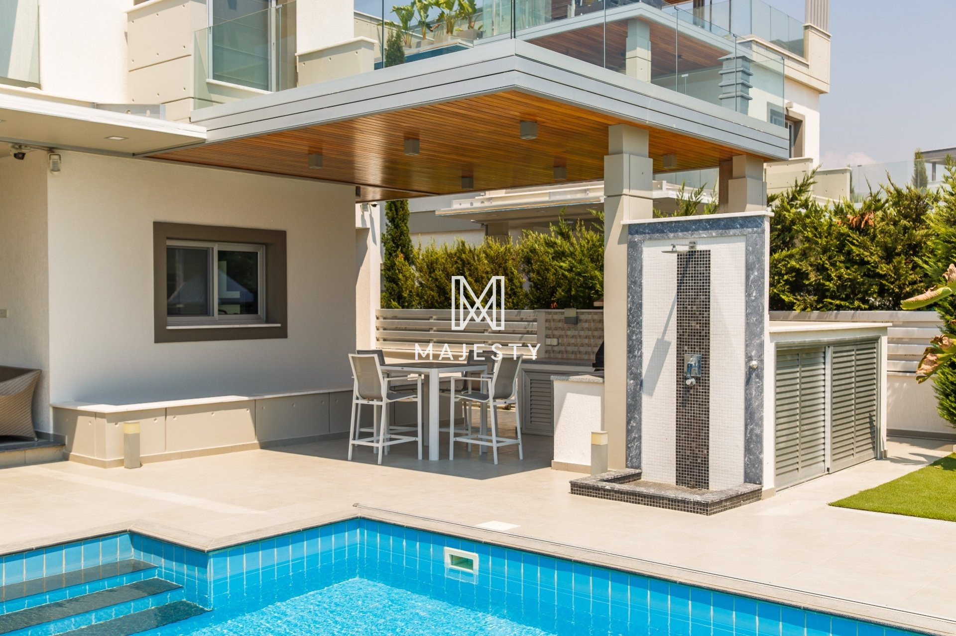 An ECO-friendly villa, fully autonomous with Zero energy consumption having its own central photovoltaic system and much more. This is a modern, classy and beautiful 3+1 bedroom villa in prestigious area of Agios Tychonas, close to all necessary amenities and infrastructure within a few minutes drive from the beach and Four Seasons Hotel. Property features beautiful and mature landscaped garden with a private swimming pool, outdoor shower and a BBQ area. Ground floor accommodates spacious open-plan living and dining area with an open but separate kitchen and a guest toilet. Second floor features 3-bedroom, master bedroom is en- suite, main bathroom and a terrace with access from master and guest bedrooms. Basement can be used as a maid’s quarters or a guest studio with a bedroom, living room and a shower room. Villa is fully furnished and equipped with alarm system and CCTV cameras, central air- conditioning system and underfloor heating. Top floor features lovely roof terrace. Marble stairs. Covered garage and storage.