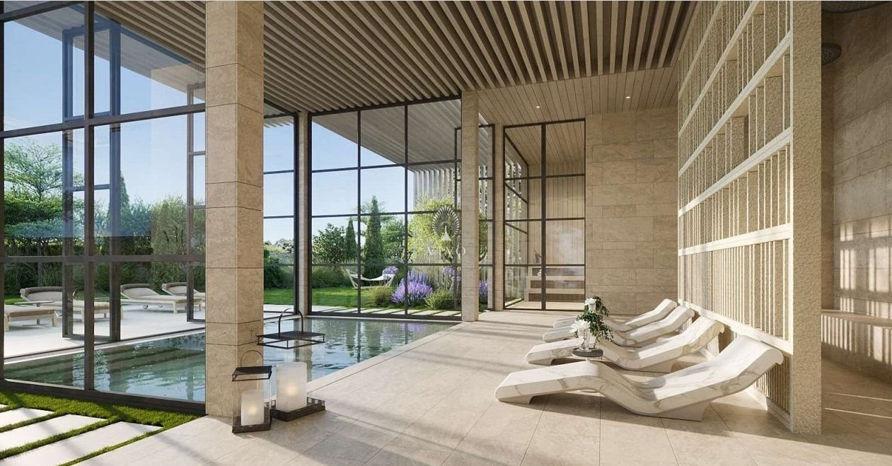 Wellness center with an outdoor swimming pool, a complex for spa treatments, a fitness area, lawns for yoga and meditation
