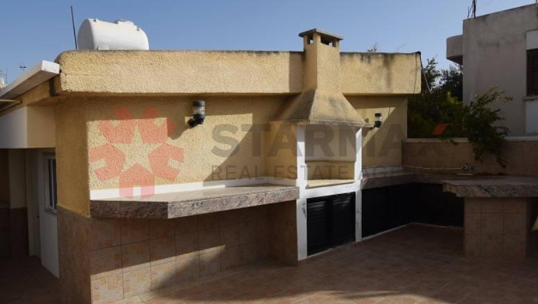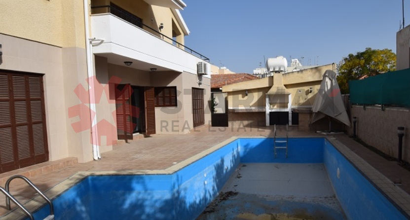 The house has a total area of 400sqm and comprises of a living room, a dining room, a kitchen, a laundry room, an office and a guest toilet room on the ground floor. The first floor comprises of five bedrooms, three with en-suite and a family bathroom.Storage space is available in the basement and in a small building in the yard. The house is equipped with central heating, a fireplace and split units.The property offers two covered parking spaces, a barbeque area and a private swimming pool.The wider area of the property is mostly developed with residential units, such as apartment buildings and houses. Strovolos municipality offers all kinds of amenities and has a quick access to the Nicosia city centre.The property falls within the residential planning zone Kα4, with building density coefficient of 120%, coverage coefficient 50%, in 3 floors and a maximum height of 13.5m.Contact us to arrange your viewing today!