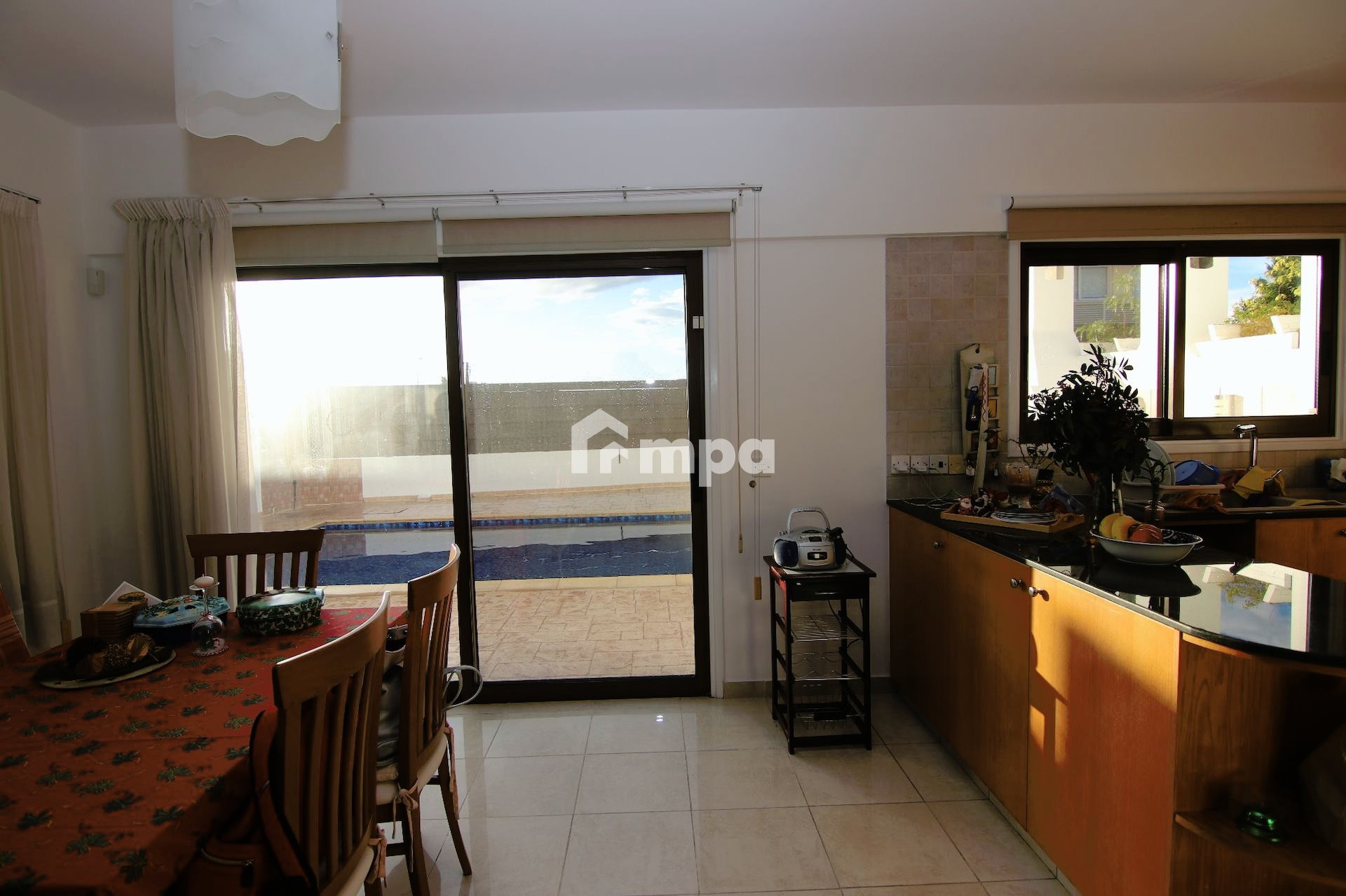 At the entrance you can find the living room and a few steps lower is the kitchen, the guest toilet and the back yard with the pool.
