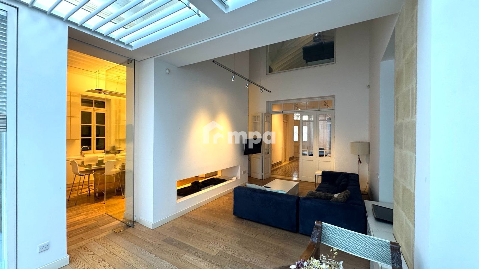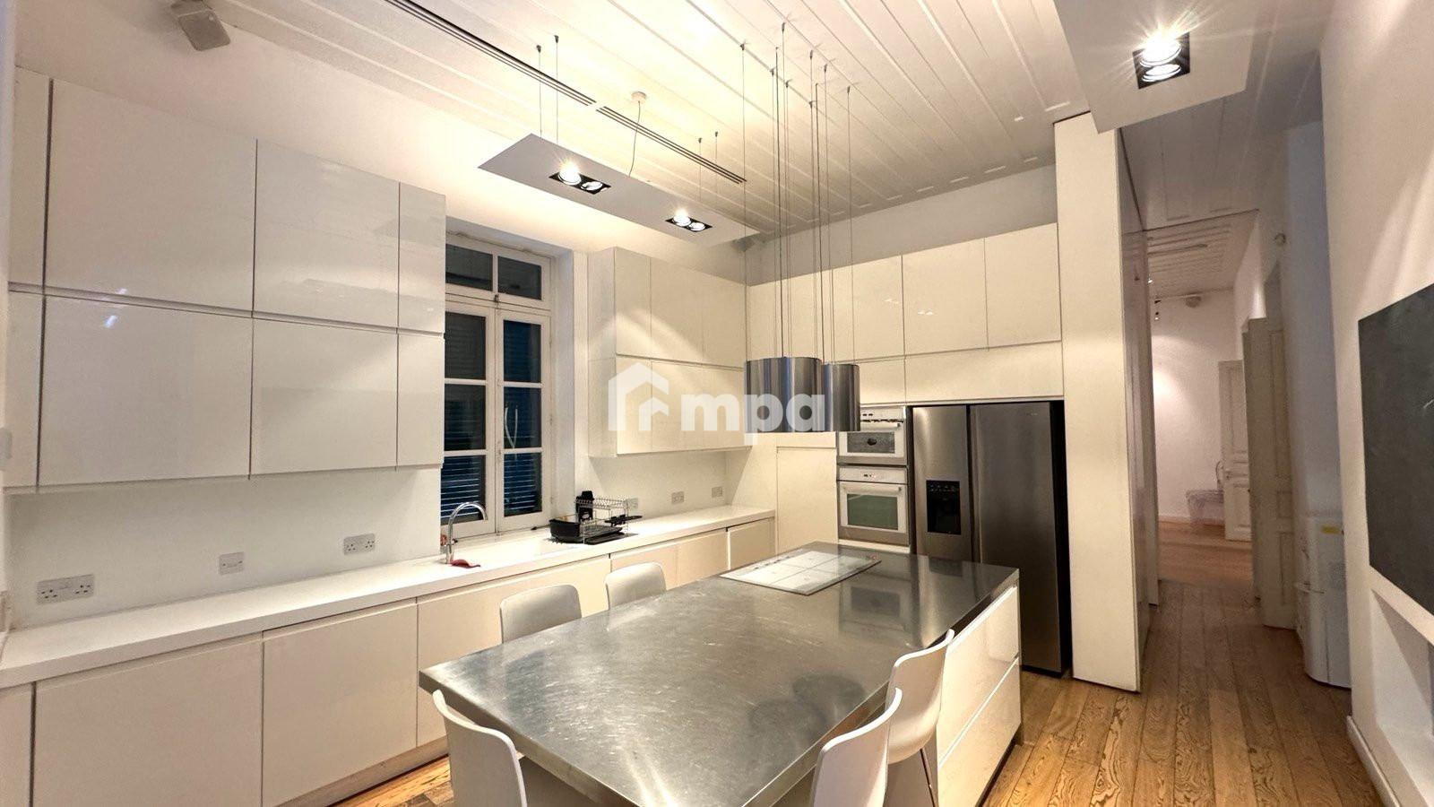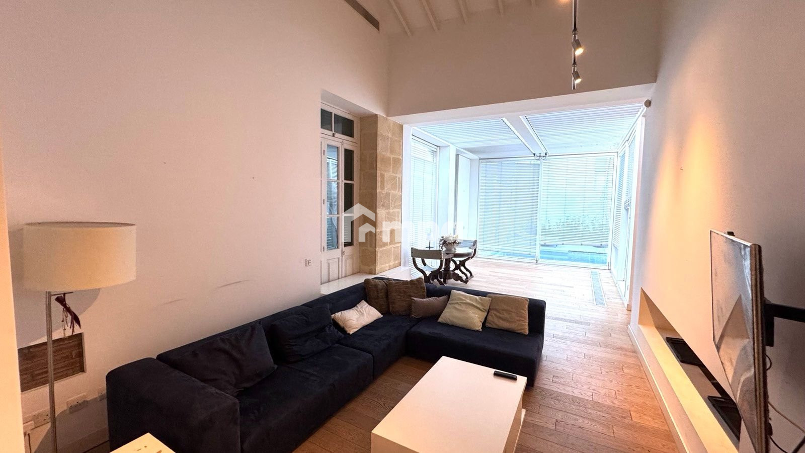 The house is designed to make the most of natural light, with large windows and glass doors that offer stunning views of the expansive swimming pool and the lush, mature garden.