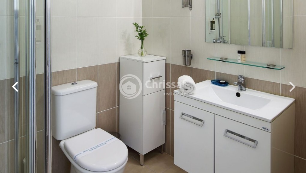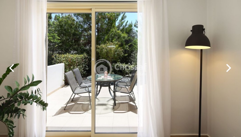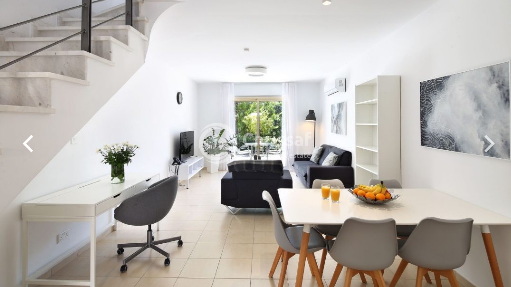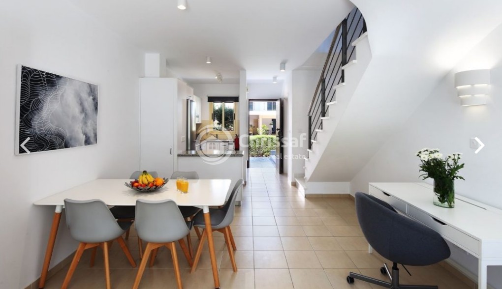 This spacious two bedroom townhouse has a modern open plan living/dining area & kitchen separated by the breakfast bar. The living area leads out to a veranda and garden area. There is also a cloakroom on the ground floor. Two double bedrooms with fitted wardrobes and family bathroom located on the upper floor. Master bedroom has an en-suite and enjoys a private balcony with views to the garden and the green area of the project. The large stunning communal swimming pools make this beautiful 2 bedroom townhouse house a perfect choice.