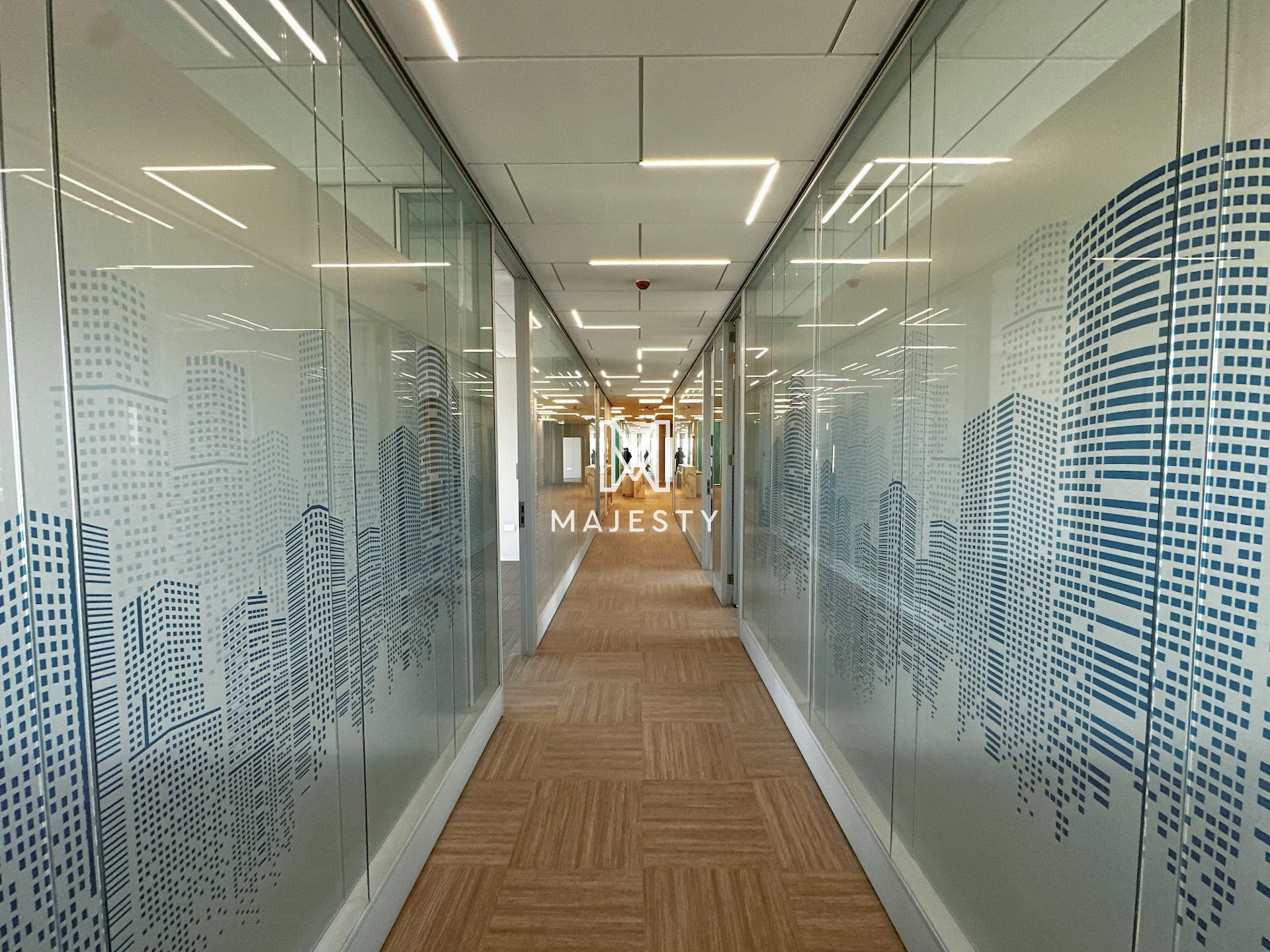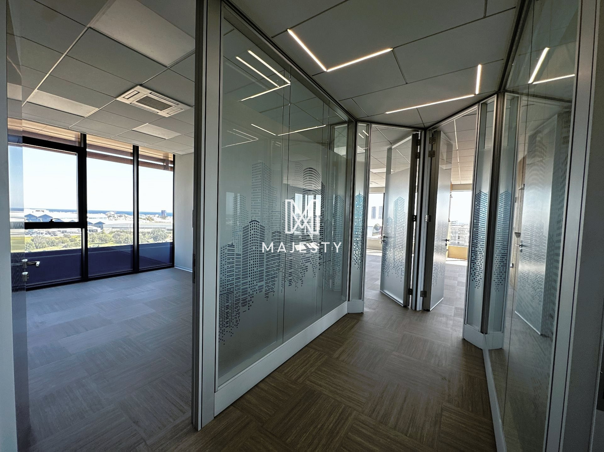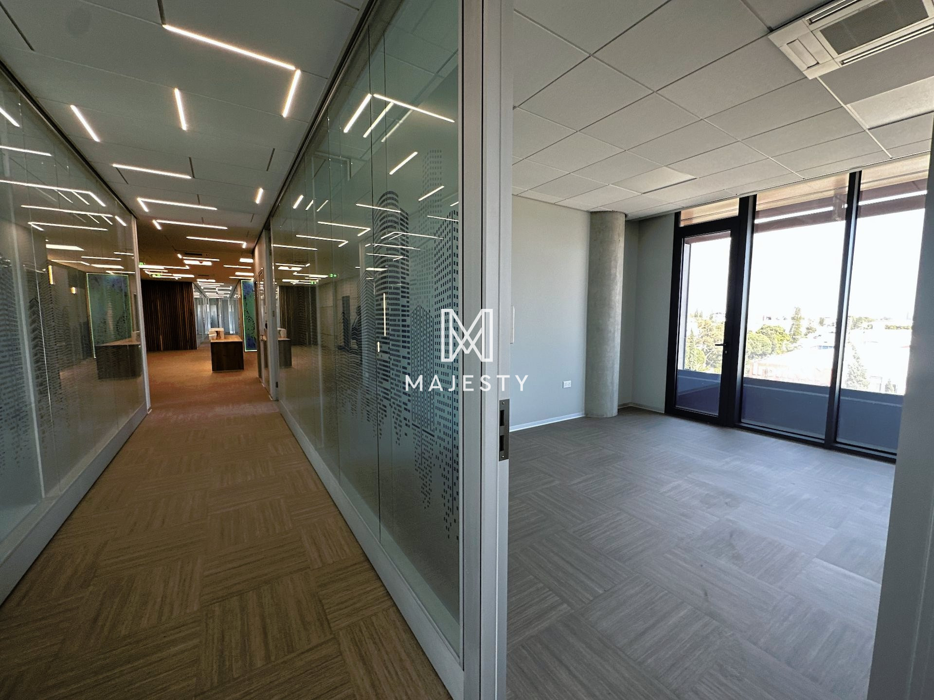 Newly constructed with 13 parking spaces available, including both covered and uncovered options, and boasting a designer interior with 15 enclosed offices, a separate reception area, and 6 separate enclosed toilets with shower facilities. Additionally, the office features 2 server rooms with independent AC supply, a large fitted kitchen with dining area, Mitsubishi Aircon VRV systems, noise insulation in walls, raised floors with Tarkett antistatic and noise insulating floor cover, LED lights by Philips, preinstalled network cabling, and the flexibility to be split into two independent offices with separate entrances, power supplies, and AC systems.